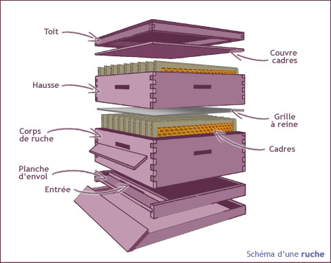 La ruche la plus courante en France est la ruche verticale à cadres ; elle se compose d’un empilement de caissons, de hauteur égale ou non, ouverts au-dessus et en dessous. En bas, on retrouve un plancher qui, débordant sur un côté, constitue une plate-forme, appelé planche d'envol, d’où entrent et sortent les abeilles. Il est surmonté des éléments principaux de la ruche : le corps et la hausse. Le corps de la ruche, la maison des abeilles !Composée de 10 cadres, elle joue le rôle de nurserie et de garde-manger pour le stockage du pollen et du miel. Nous veillons à ce que les abeilles aient suffisamment de provisions et de place pour se multiplier. Nous ne récoltons jamais les cadres des corps de la ruche.