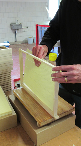 Nous renouvelons donc les cires d’une partie des cadres de la ruche chaque année. Au cours de l'extraction du miel, nous récupérons de la cire d'opercule (entre 300 et 500 kg par an). Cette cire est confiée à un gaufrier qui la façonne pour produire des feuilles avec l'empreinte des alvéoles.