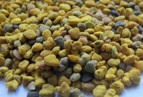 Le pollen est la graine mâle des fleurs. Les abeilles le récoltent en allant de fleurs en fleurs. Elles le rassemblent sous formes de pelotes de pollen accrochées sur leurs pattes. Les abeilles utilisent le pollen pour se nourrir. Il est riche en protéines. Elles mélangent le pollen et le miel qui donnent le pain d’abeille. Le couvain est nourri avec ce mélange. Cette nourriture apporte glucides et protéines. Pour employer une image plus parlante, on peut dire que le miel représente les pâtes et que le pollen est un steak.